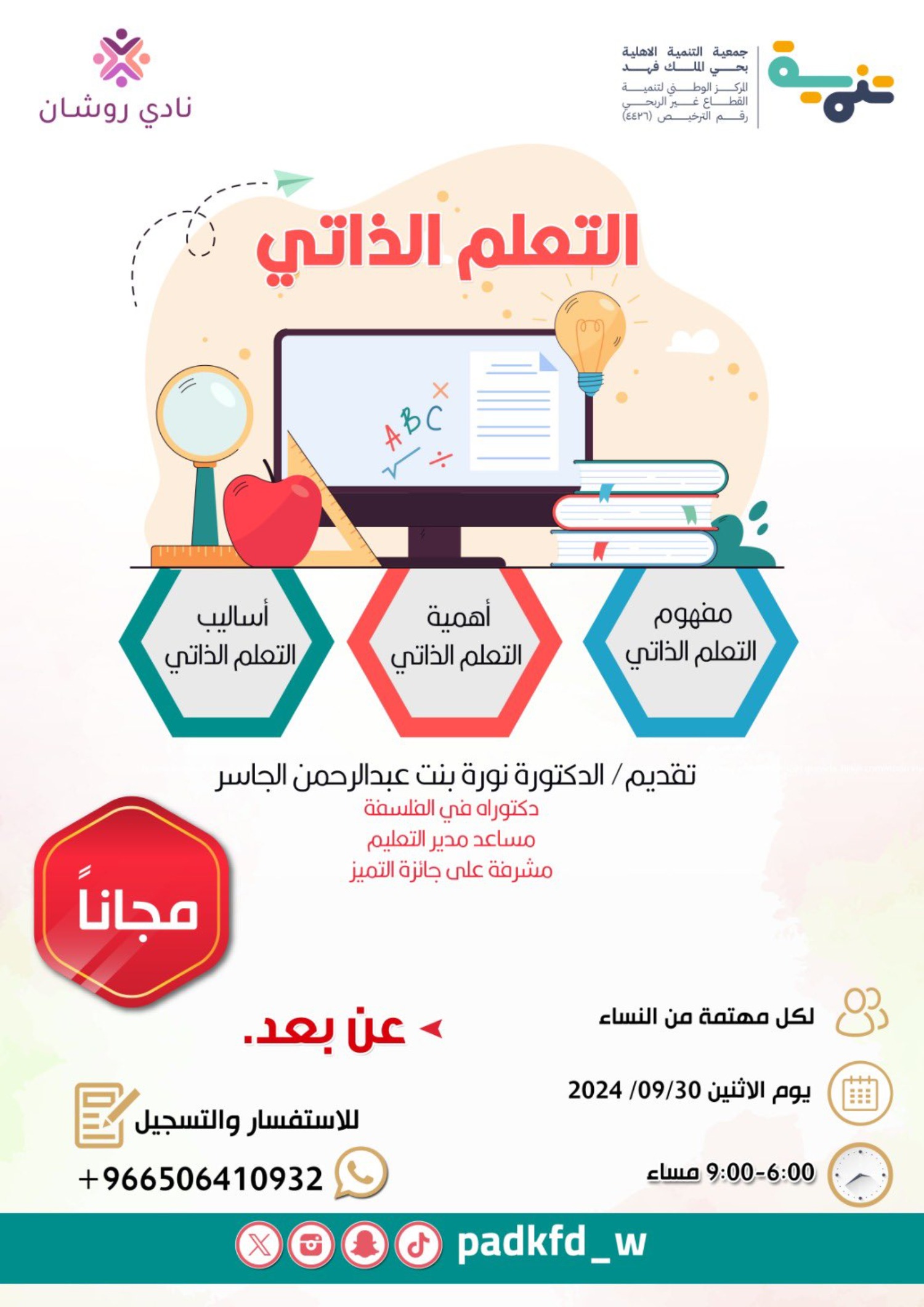 ورشة التعلم الذاتي أقام نادي الروشان ورشة بعنوان التعلم الذاتي من تقديم د. نورة الجاسر حيث بلغ عدد المستفيدات 23 مستفيدة. مجاناً عن بعد عبر منصة الزووم