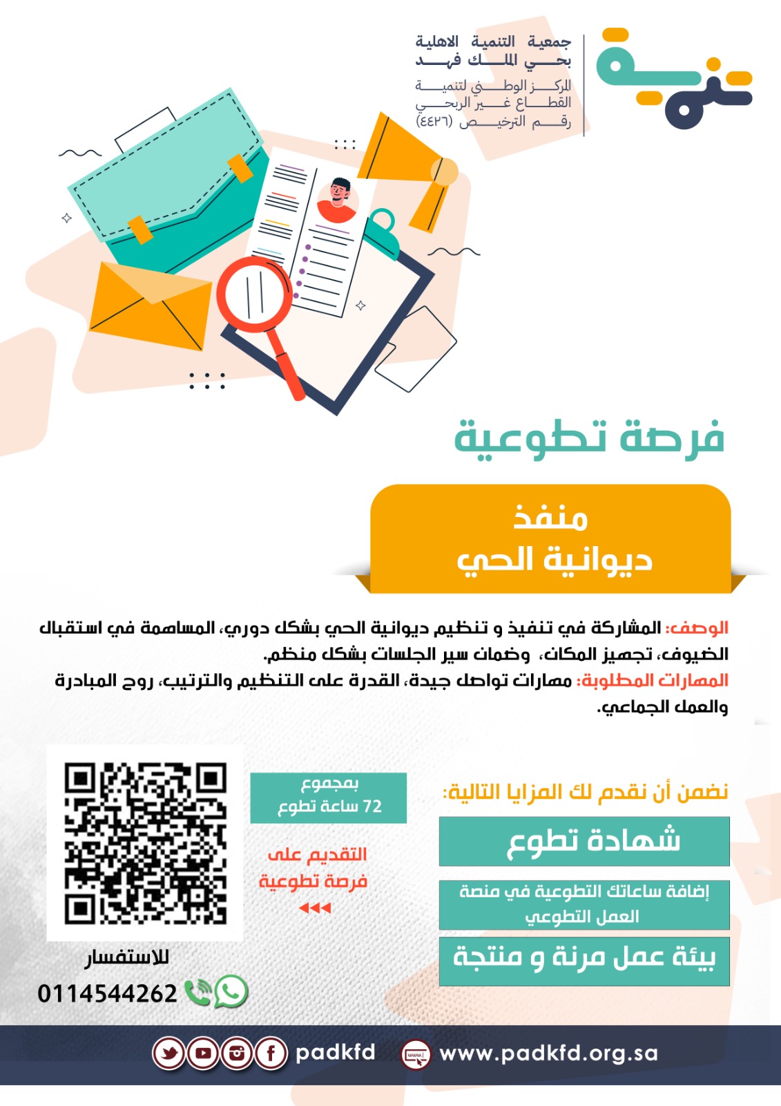 الوصف: المشاركة في تنفيذ وتنظيم ديوانية الحي بشكل دوري، المساهمة في استقبال الضيوف، تجهيز المكان، وضمان سير الجلسات بشكل منظم.